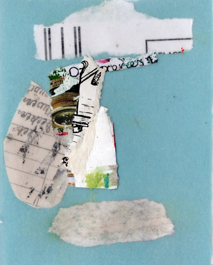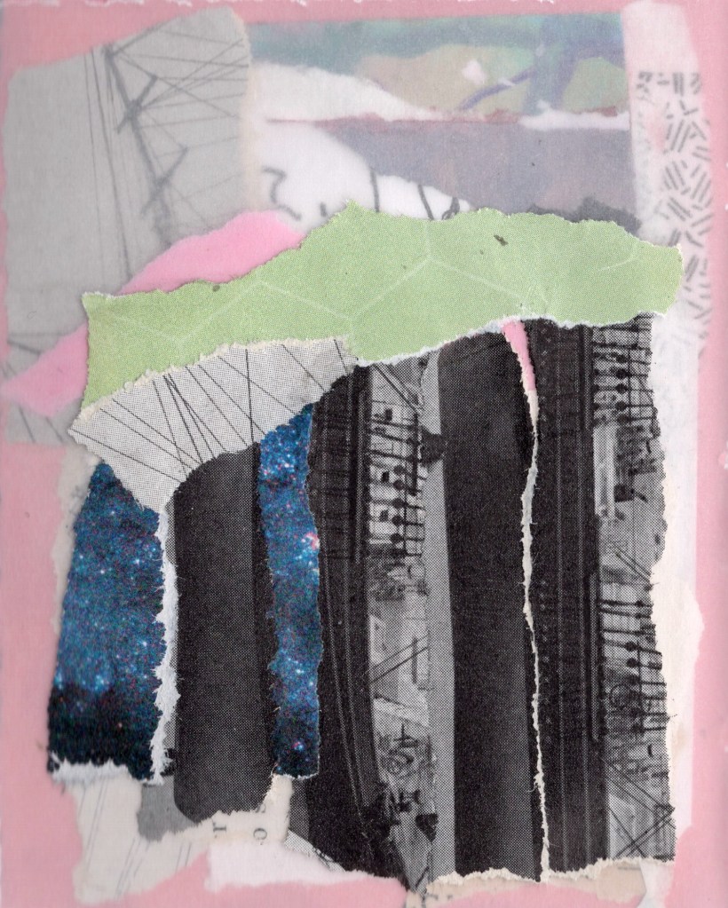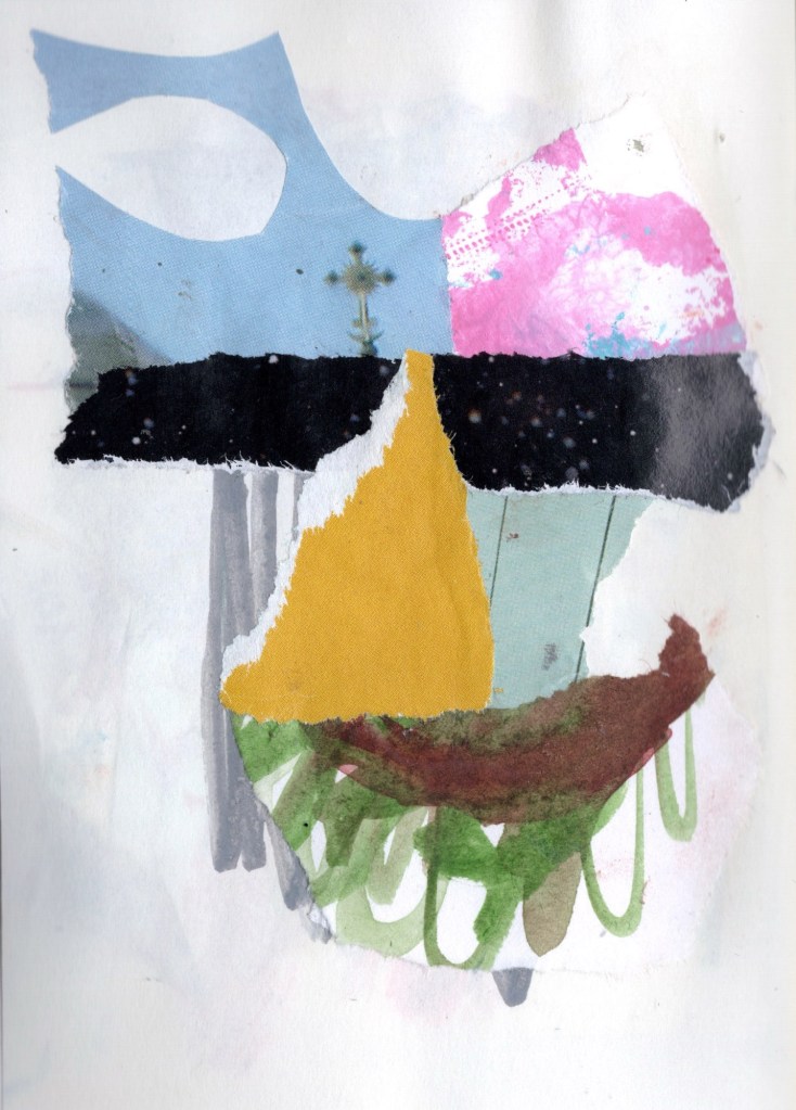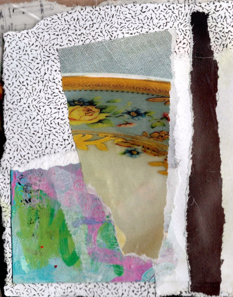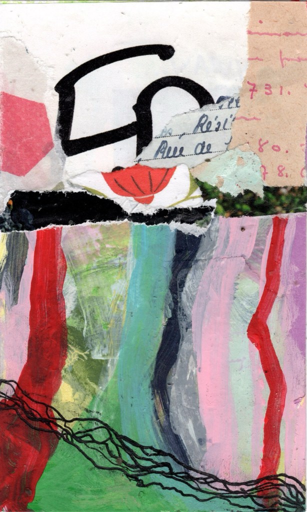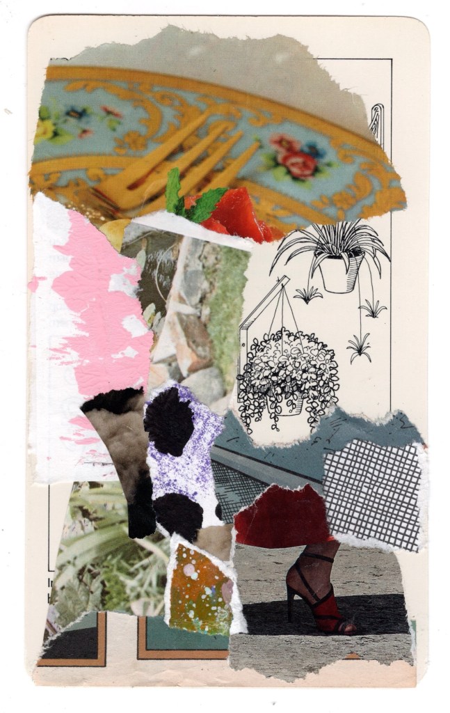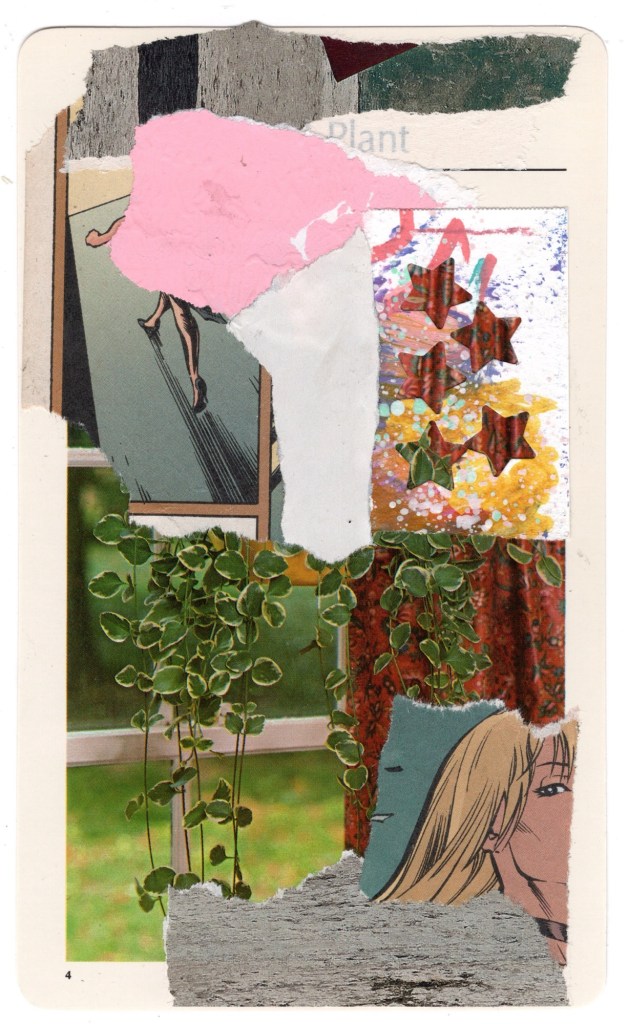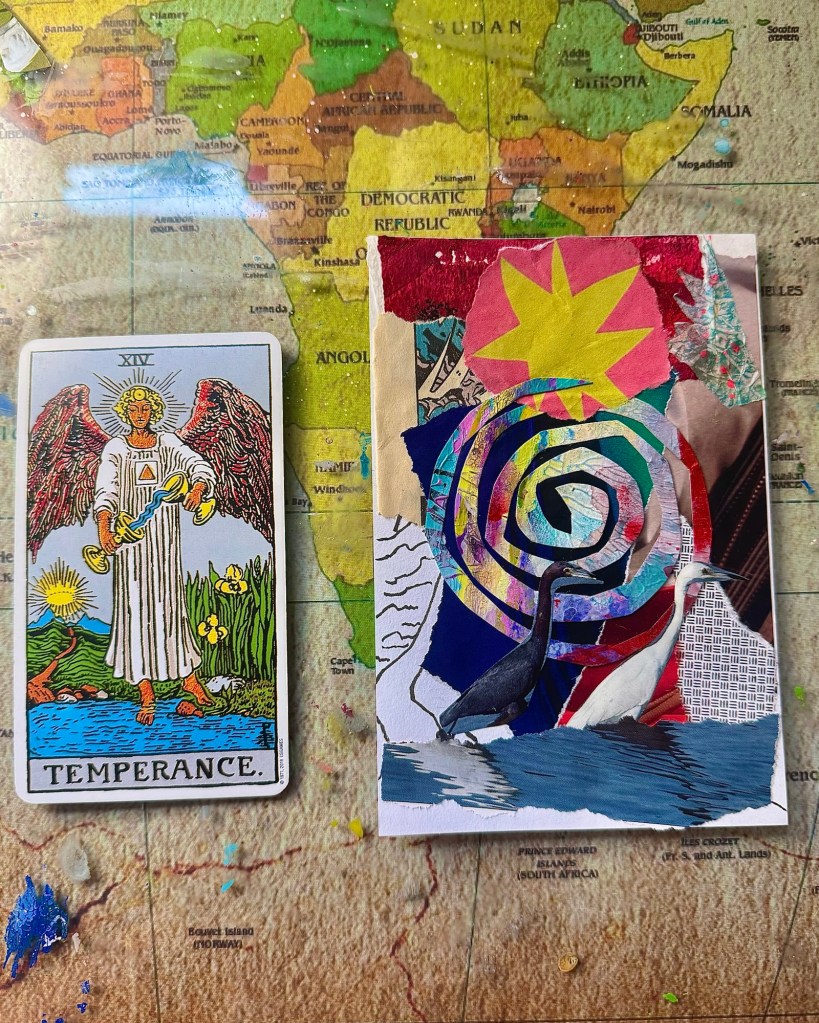 Collage and stitching are two methods that help me to re-enter my body. This was made on Saturday after my morning pages. I found the process to be very therapeutic. I kept the four of wands card upright on my desk, following my desires intuitively for how I wanted this to turn out. Another collage I did Tuesday while meditating on the card is below.