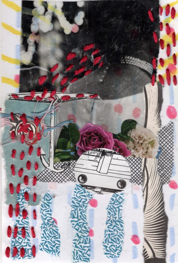 A collage done on an index card. It includes an image transfer of a woman’s back shoulders and head, she wears an ornate pearl necklace. Beneath this, two images stand out: colorful flowers behind a black and white circle, and a black and white anchor. There is red thread stitching throughout the piece, mostly in rows of four. This collage was done meditating on the four of wands.