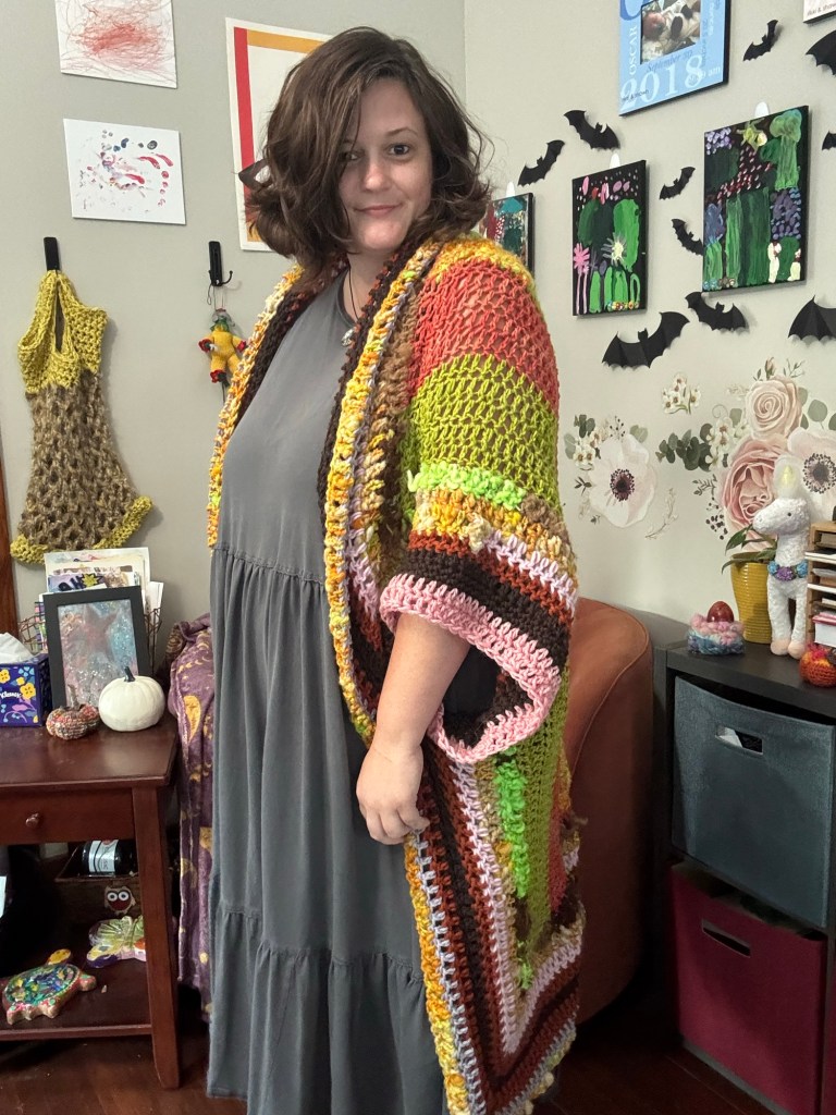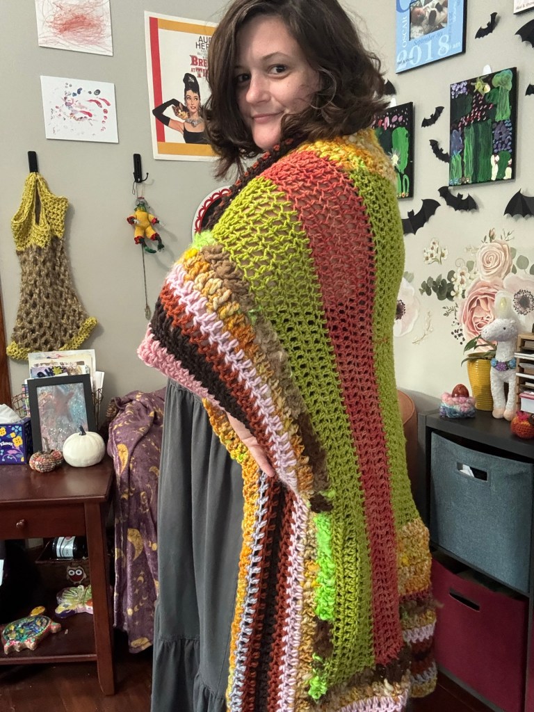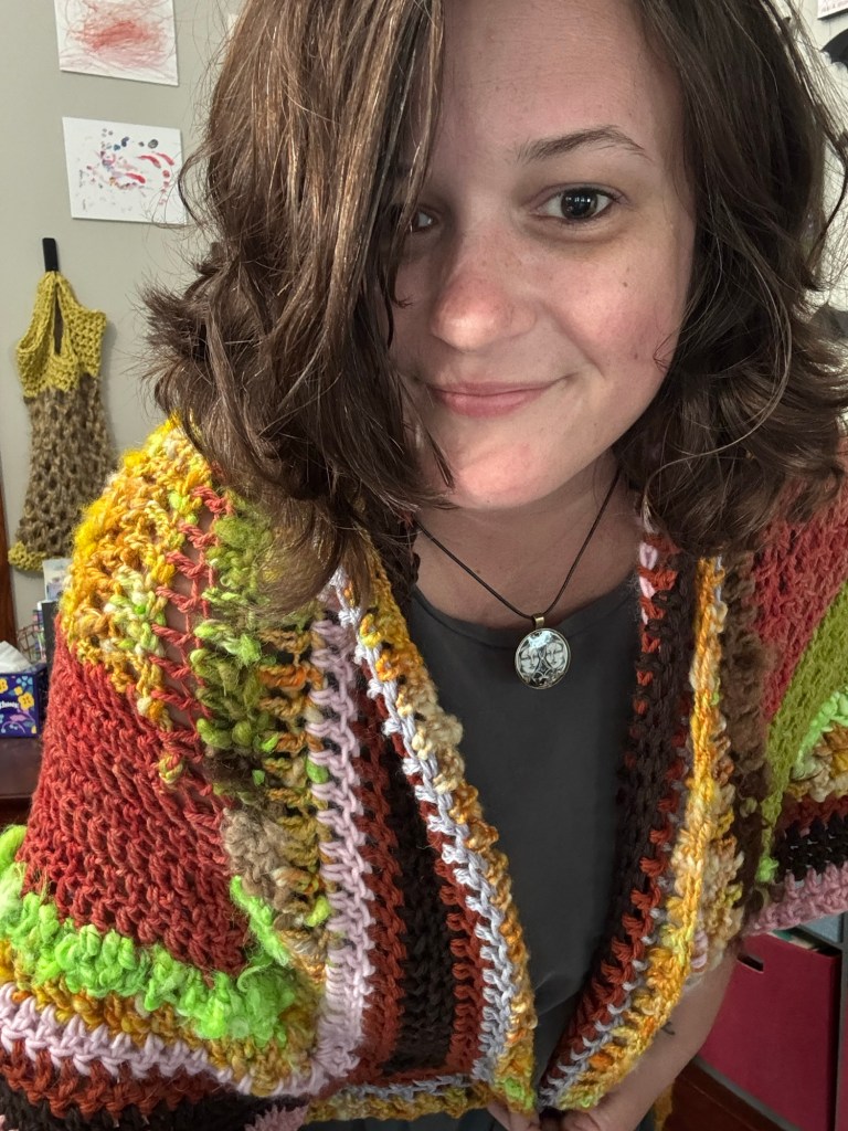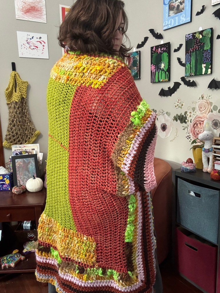 freehand crochet sweater done, using lots of yarn from the first fiber festival I went to earlier this year 💚 my creativity takes many forms. 🦋