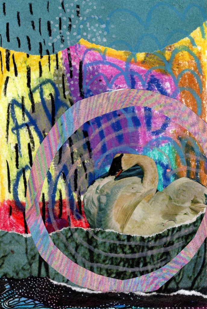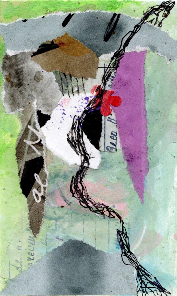This is a collage done on an index card. There are markings on the card, which show through the vaguely see-through image transfer on the bottom. The image is of two geese (honestly a guess) which to me symbolize the two celebrating within the card. The top portion of the collage is divided into sections, primarily black and white…except a portion between which has four vertical lines in red and outlined in black. This piece was done while meditating on the four of wands.