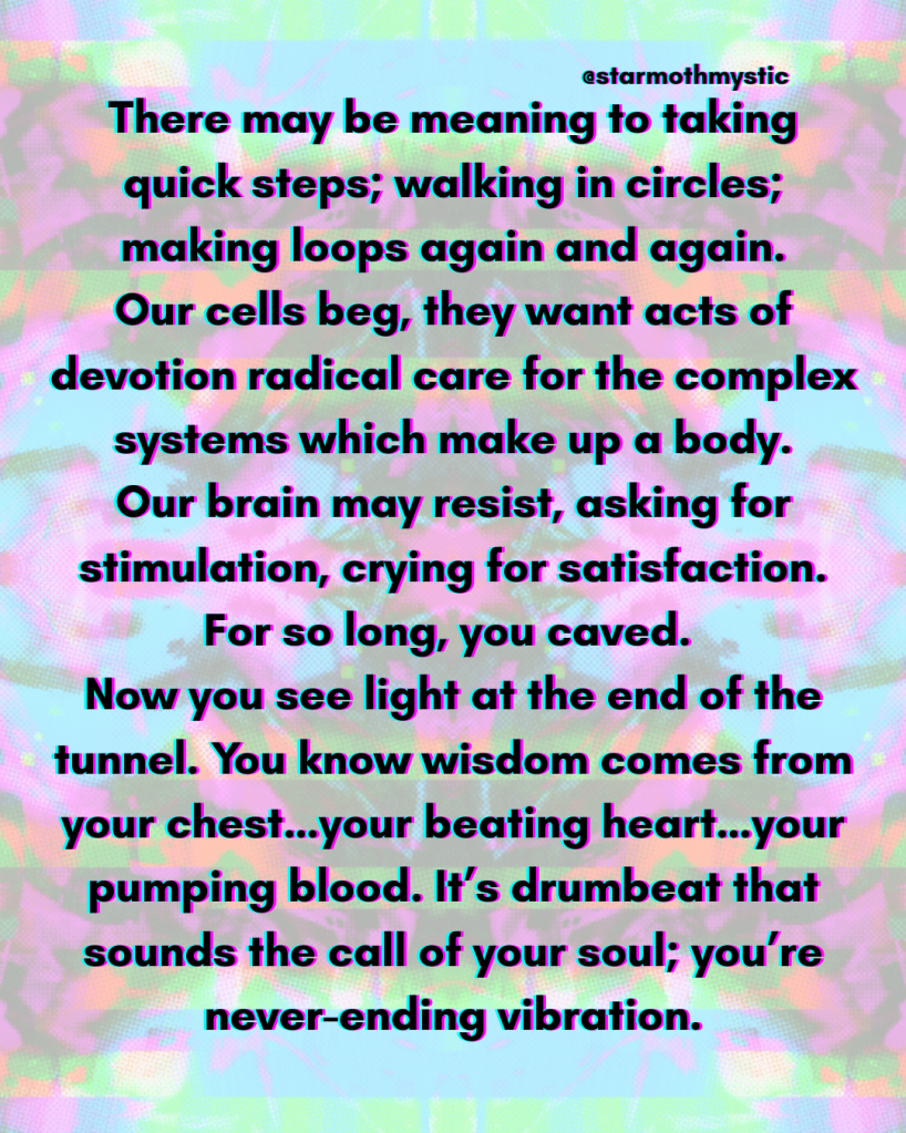 This comes back to strength because it brings me back to myself. Much like the infinity symbol above the person’s head in the card, I am reminded of forever returning. The daily minutiae used to be the bane of my existence…now it is an act of worship. I still struggle to pick up a dishcloth everyday. Laundry remains in the washer too long. But I am gentler. I am a buoy that gently rocks back and forth, back and forth. I may stray from the practices that help to keep me aligned with my body, my values, my soul…but I find my way back, each time a little bit quicker.