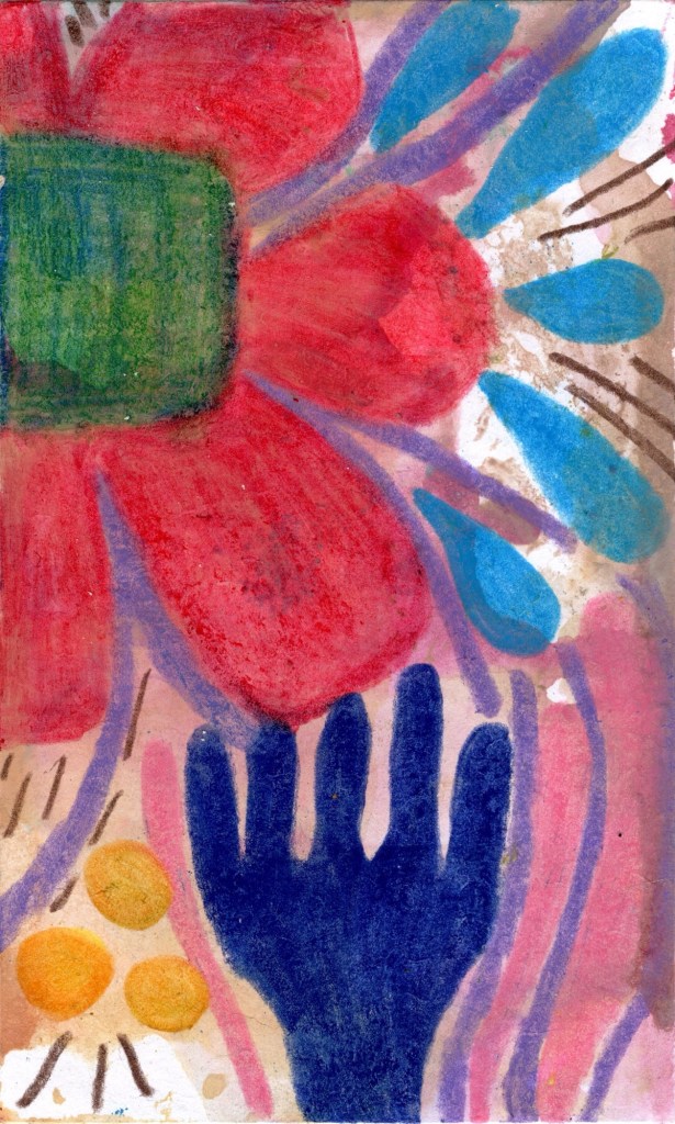 The flower feels reminiscent of the card, a collection of color and particles all coming together. The flower pushes out of the seed and up through the earth, searching for sunlight. It is held by all of the little pieces of the puzzle that fall into place before, during, after. This makes me think of those we may rely on. Nature as community, celebrating each other through the act of life, death, rebirth. Another representation of the three chalices held by three people.