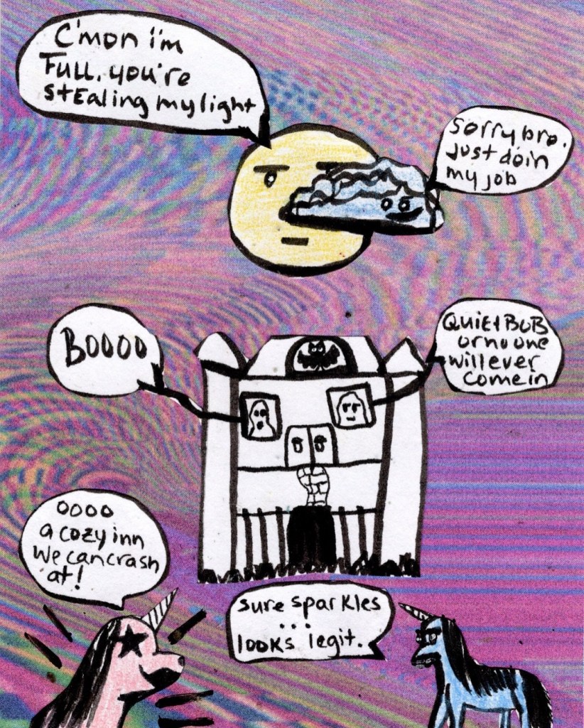 I combine the prompts for haunted house and unicorn to make a comic for this page.