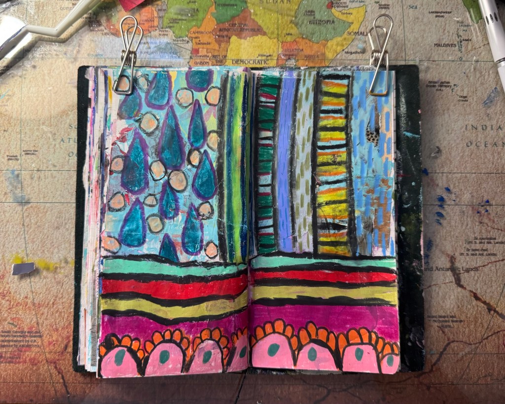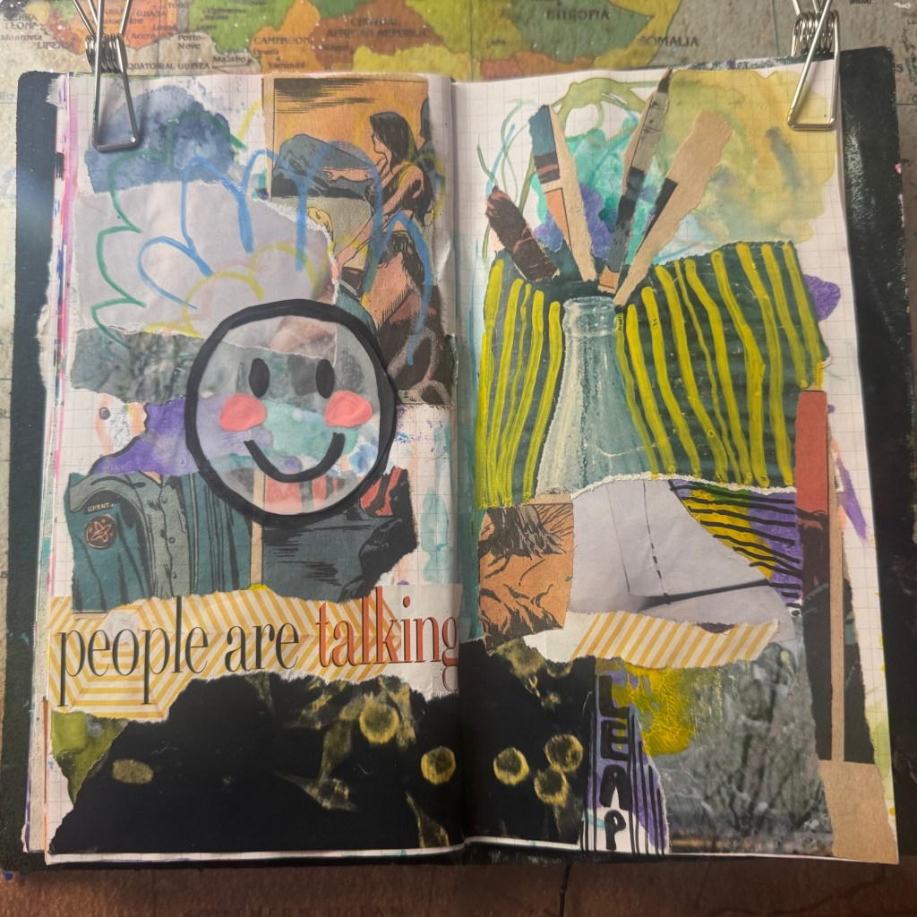 I made a little journal that included vellum pages and have been able to create some really fun collages. It’s been so fun I filled the journal in two days! I’ll be uploading all of these designs to Redbubble.