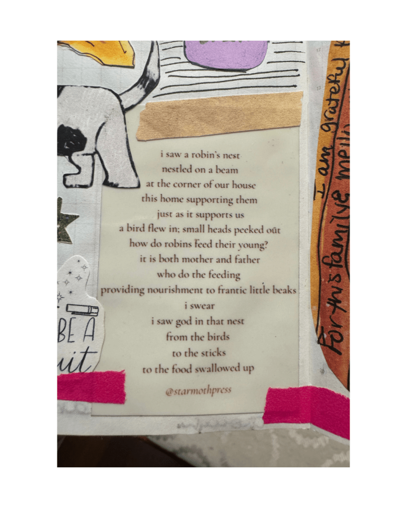 I was incredibly proud of this piece. I am trying to push the bounds of my collage practice. I am trying to include new subjects and shapes, patterns and colors. The sunflower was cut out of a copy of How to Know the Wild Flowers. This was done on a co-working live, and it took immense concentration. But, again…I think one of the main takeaways for me on my creative journey this year has been that sitting with discomfort is a part of it. That’s where this TikTok came from. I filmed a beautiful monarch butterfly outside in the backyard. I was baking in the heat (it’s still in the 80s in the Midwest) because the dog wanted to peruse the whole property…or so it seemed. She was doing dog things, I was observing our (still) blooming zinnia patch when I turned to find this gorgeous creature just chilling on our hedgerow. The thing is, I wouldn’t have seen her, been captivated by her beauty, or thought to record her (I’m keeping that part in a little box labeled LOOK AT THIS LATER WHEN THE WORLD IS LESS WILD). My grumpy, sweaty, tired self would’ve been obliviously inside, comfortable.