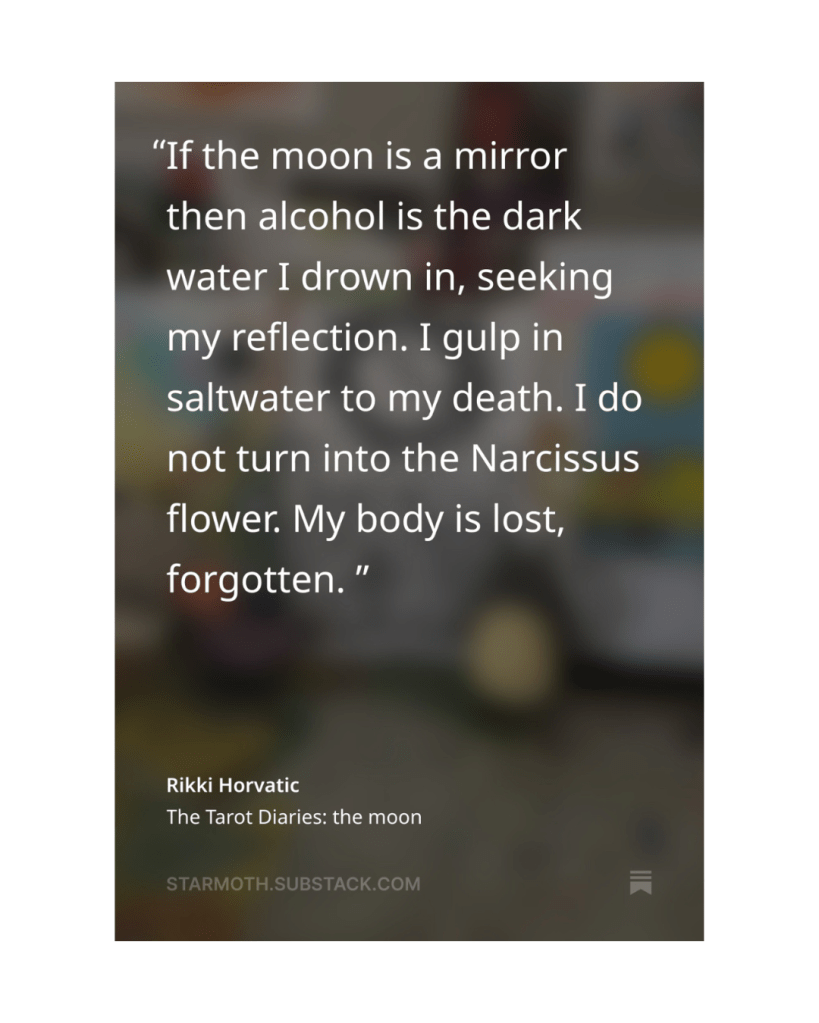 The Tarot Diaries, my 78-week project has had me delving deeper than I anticipated, much faster than expected. In today’s post I share about self-identity, the myth of Narcissus, the cloudy depths of the subconscious, dealing with the throes of sobriety and memory loss. Trigger warnings are listed at the beginning of the essay. It’s a vulnerable one folks.