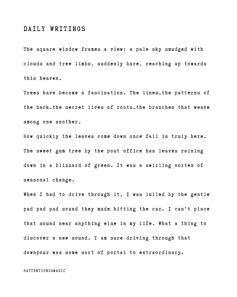 In honor of reclaiming my attention, I am trying to spend less time scrolling social media (especially while outside) or even listening to audiobooks or podcasts. It is difficult for me to admit that sometimes these distractions help me to complete tasks I have always felt resistance to.