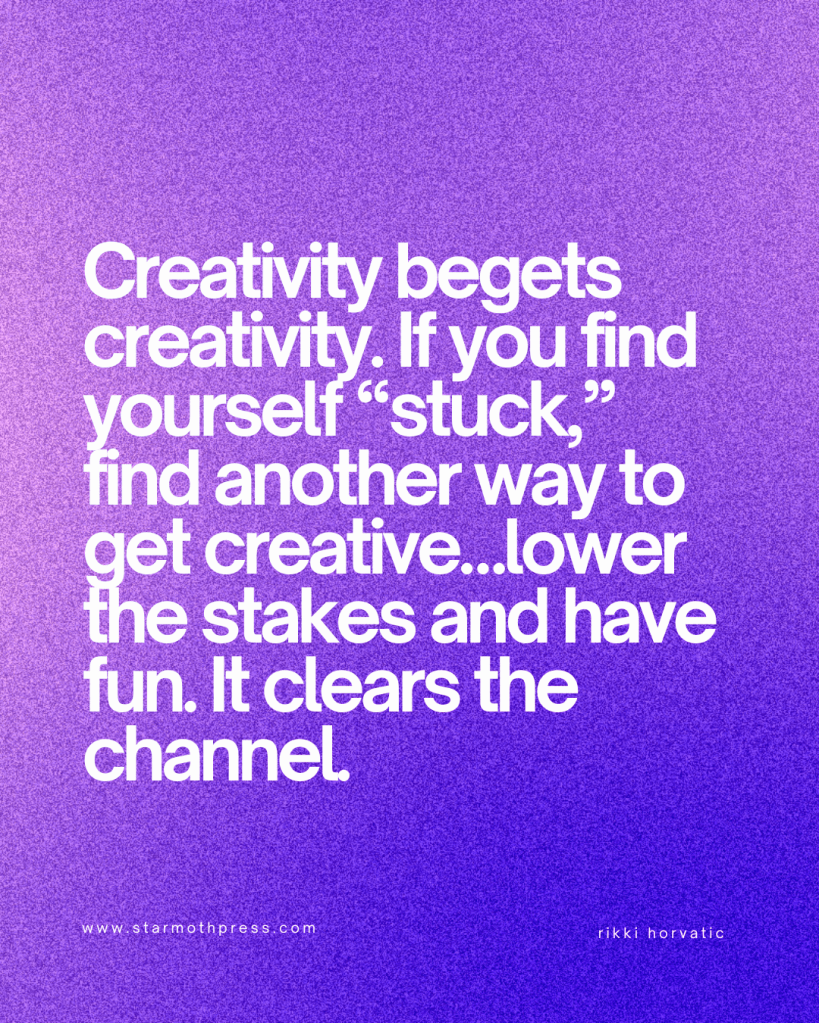 Creativity begets creativity. If you find yourself “stuck,” find another way to get creative…lower the stakes and have fun. It clears the channel.