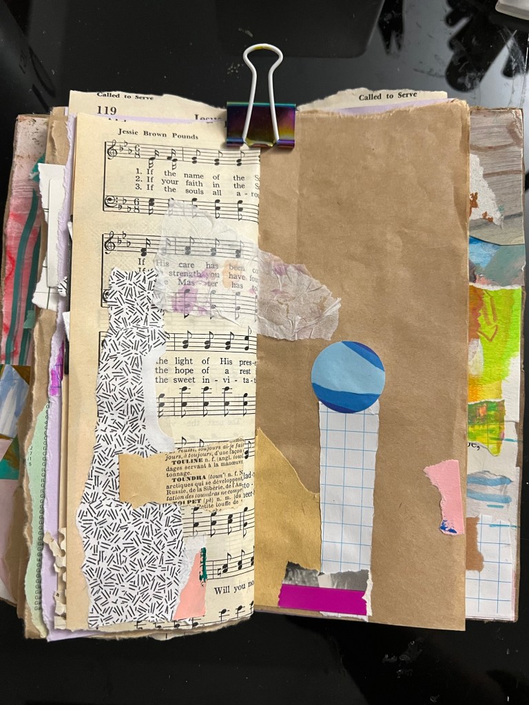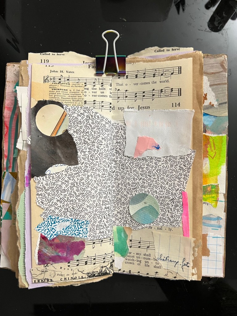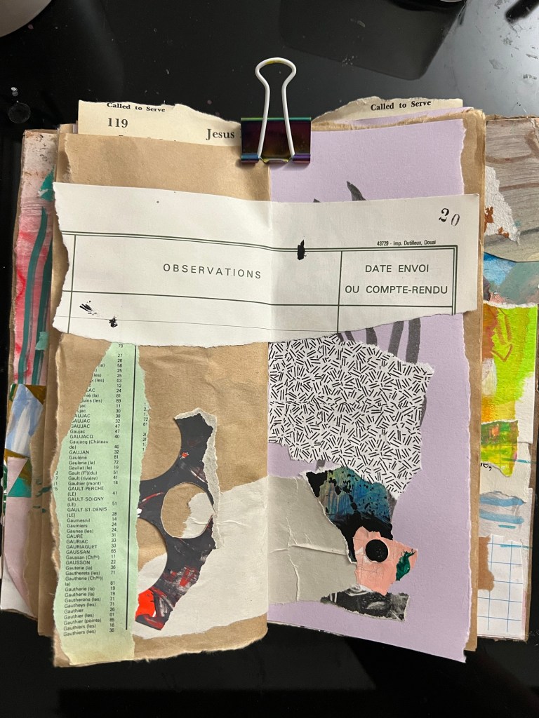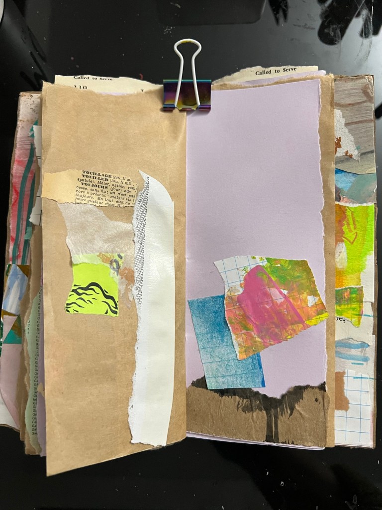 My inner critic has not been kind to my abstract collage practice. Especially as I move through it quickly, and the pages become sparse to invite tension between the elements.