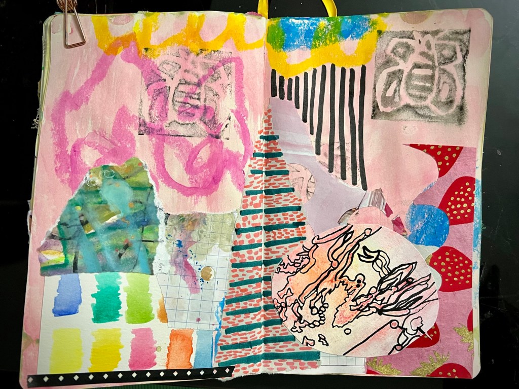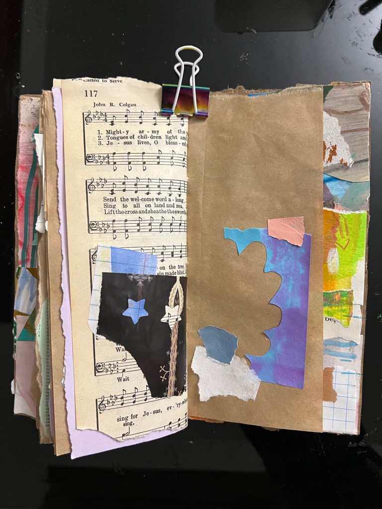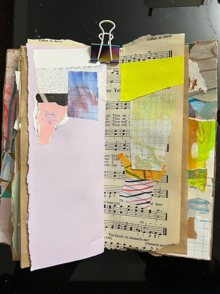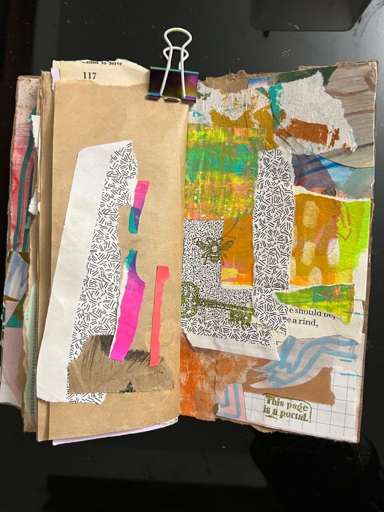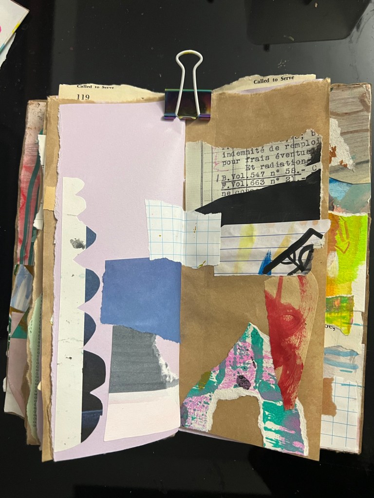 My inner critic has not been kind to my abstract collage practice. Especially as I move through it quickly, and the pages become sparse to invite tension between the elements.