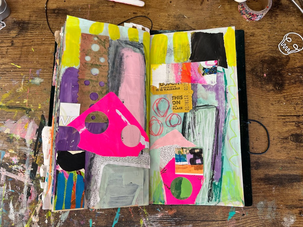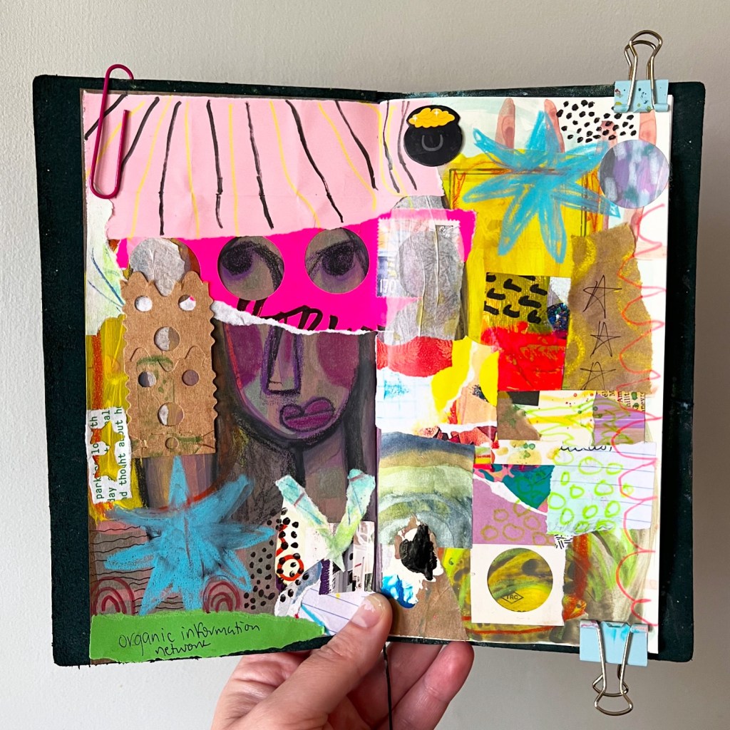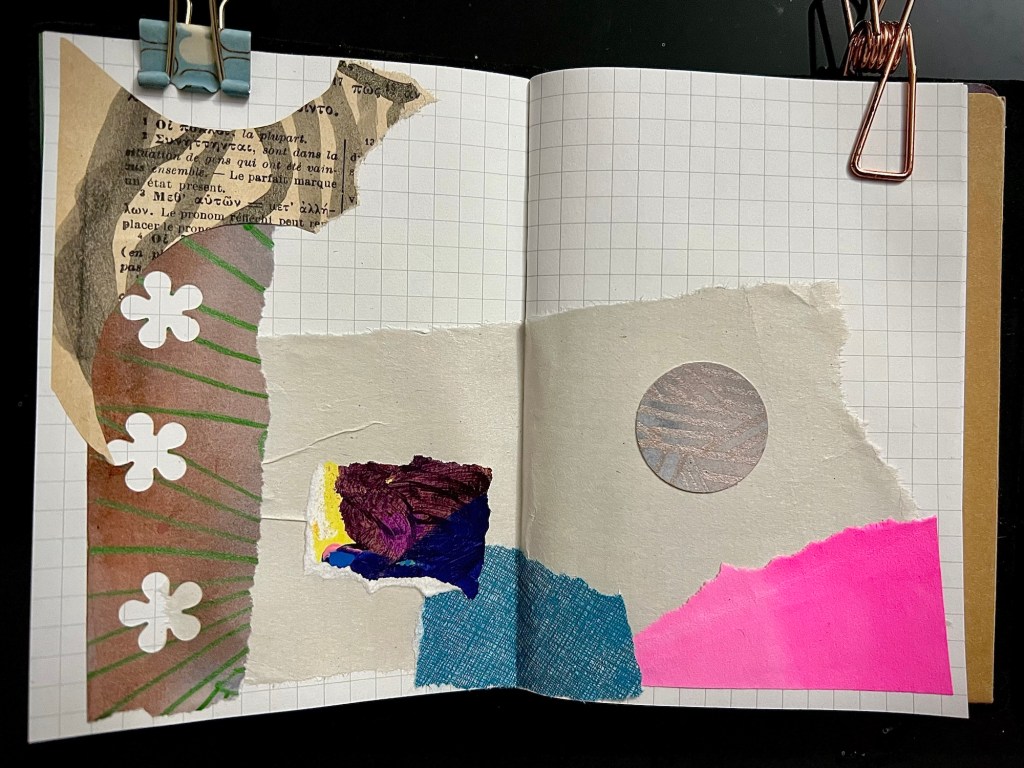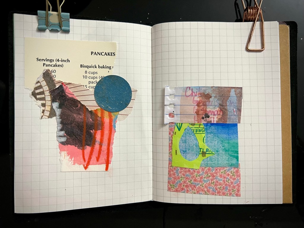 Collage pages in my travelers notebook My inner critic has not been kind to my abstract collage practice. Especially as I move through it quickly, and the pages become sparse to invite tension between the elements.